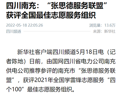 新华社客户端四川频道5月18日电日前,由国网四川省电力公司南充供电公司推荐参评的南充市“张思德服务联盟”,获评2021年全国学雷锋志愿服务“四个100"最佳志愿服务组织。