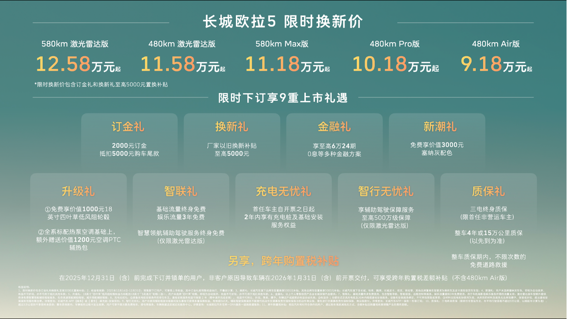 2025年12月16日,长城汽车欧拉品牌全新A级纯电SUV——长城欧拉5正式上市。新车共推出5款配置,建议零售价区间为 9.98万至13.38万元,限时换新价9.18万元起(限时换新价包含“订金礼”和“换新礼”至高5000元以旧换新补贴)。为回馈广大用户的热爱与支持,即日起至2025年12月31日,用户下订并锁单即可尊享包含订金礼、换新礼、智行无忧礼在内的9重上市好礼,以及跨年购置税补贴(不含480km Air版)等丰厚购车权益。凭借诚意十足的价格权益与越级产品力,长城欧拉5致力于成为全球年轻用户的“严选搭子”。