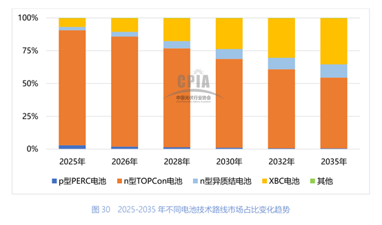 多家机构对未来技术格局给出相近判断:彭博新能源财经在《2025年组件与逆变器融资价值报告》中明确预测,2028年前TOPCon继续保持主流技术地位;集邦咨询的数据显示,至2029年,TOPCon还将保持80%以上的市场占有率;CPIA的《中国光伏产业发展路线图》中可以看出,2035年TOPCon技术仍占据50%以上的市场。