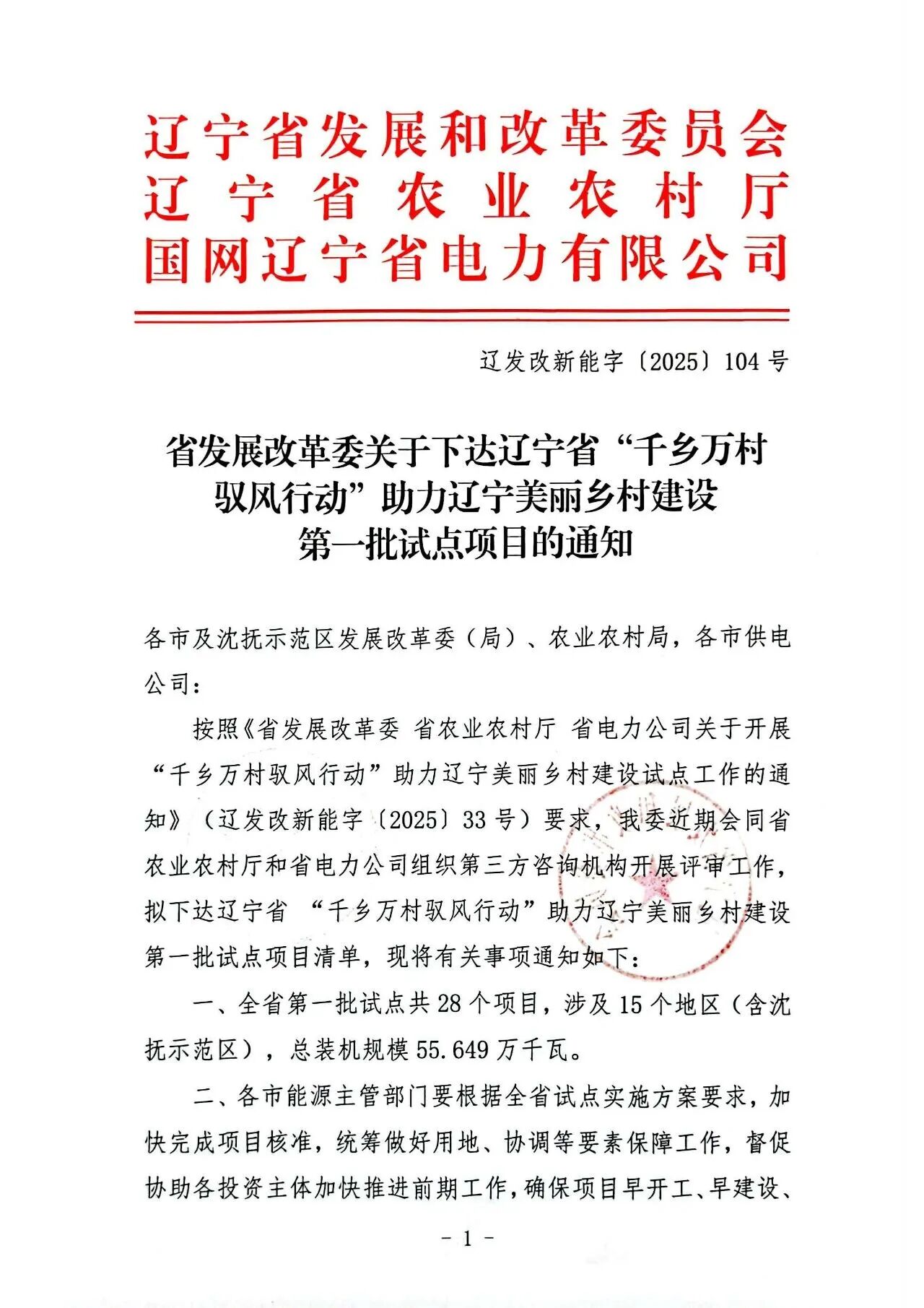 12月1日,辽宁省发改委、辽宁省农业农村厅、国网辽宁省电力有限公司发布《关于下达辽宁省“千乡万村驭风行动”助力辽宁美丽乡村建设第一批试点项目的通知》。正泰新能源与大唐、中核、华电等企业共同入围首批试点项目。根据《通知》,全省第一批试点共28个项目,涉及15个地区(含沈抚示范区),总装机规模55.649万千瓦。