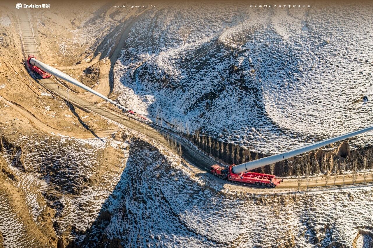 在项目现场,放眼望去是无边无际、支离破碎的黄土丘壑。所谓的“路”是依山开凿的便道,一侧是陡峭的黄土崖壁,另一侧就是深邃的沟壑,弯急坡陡,每一步都考验着运输车辆的极限性能和驾驶员的胆识。重型卡车轰鸣着,在雪后硬滑的黄土坡道上艰难爬行。长达99米的叶片,在“九曲十八弯”的山道上挪移,每一次转弯都如同一次精密的“外科手术”,需要前后车精准配合。