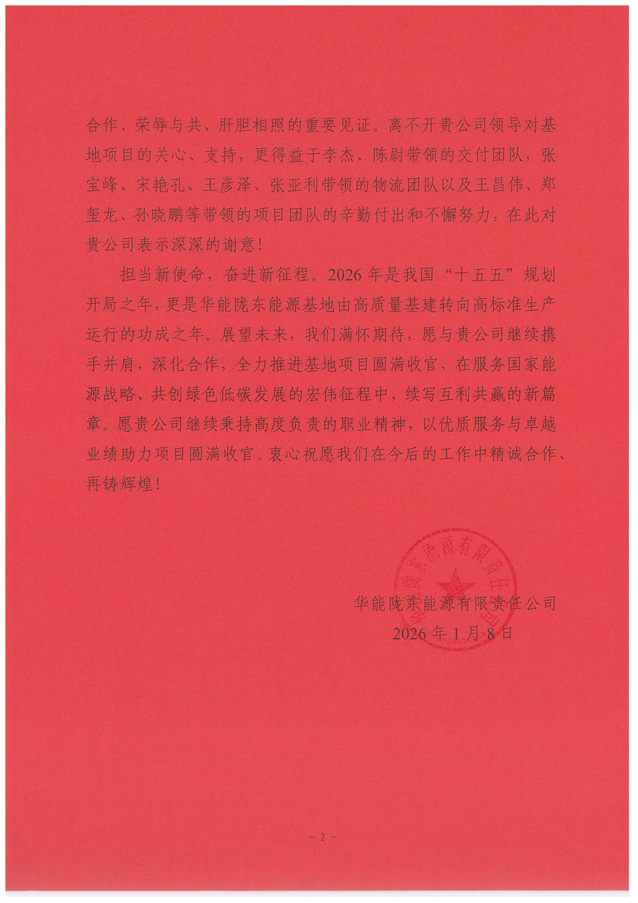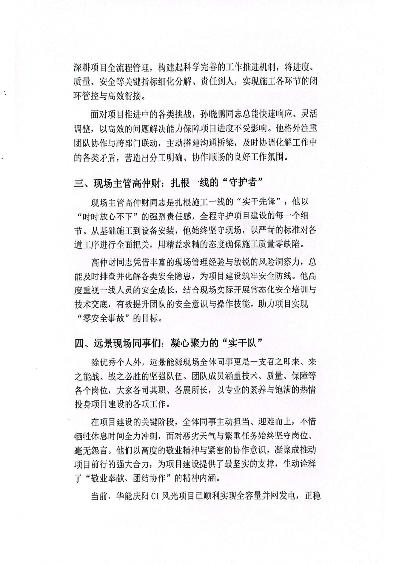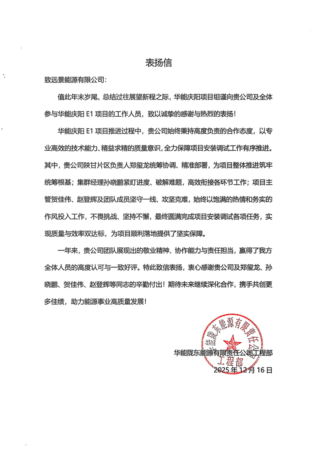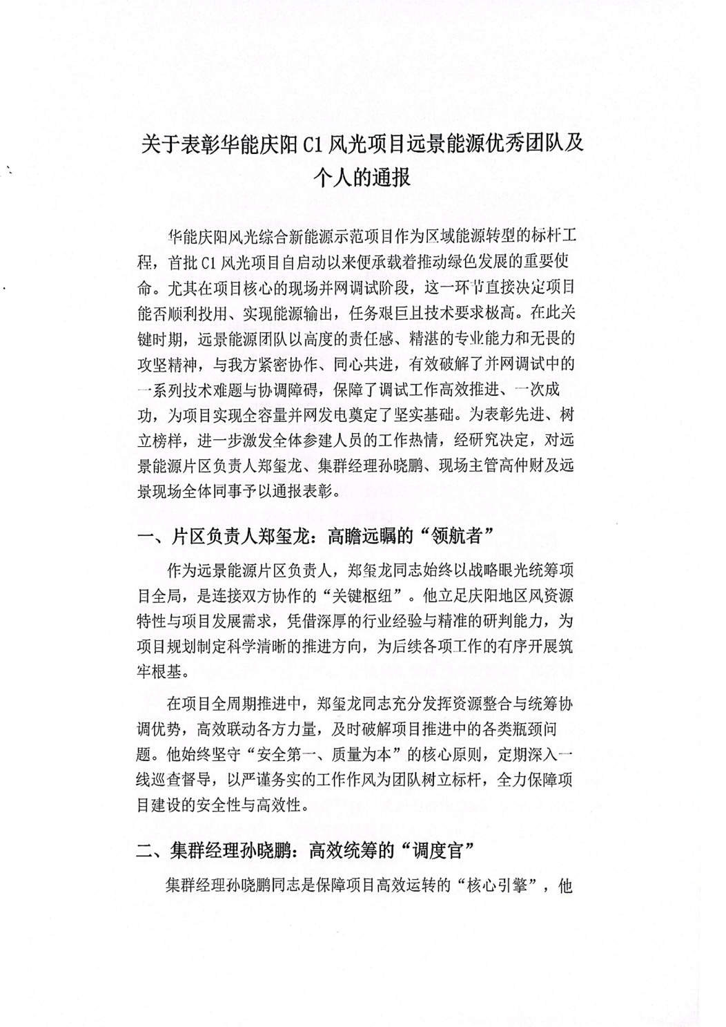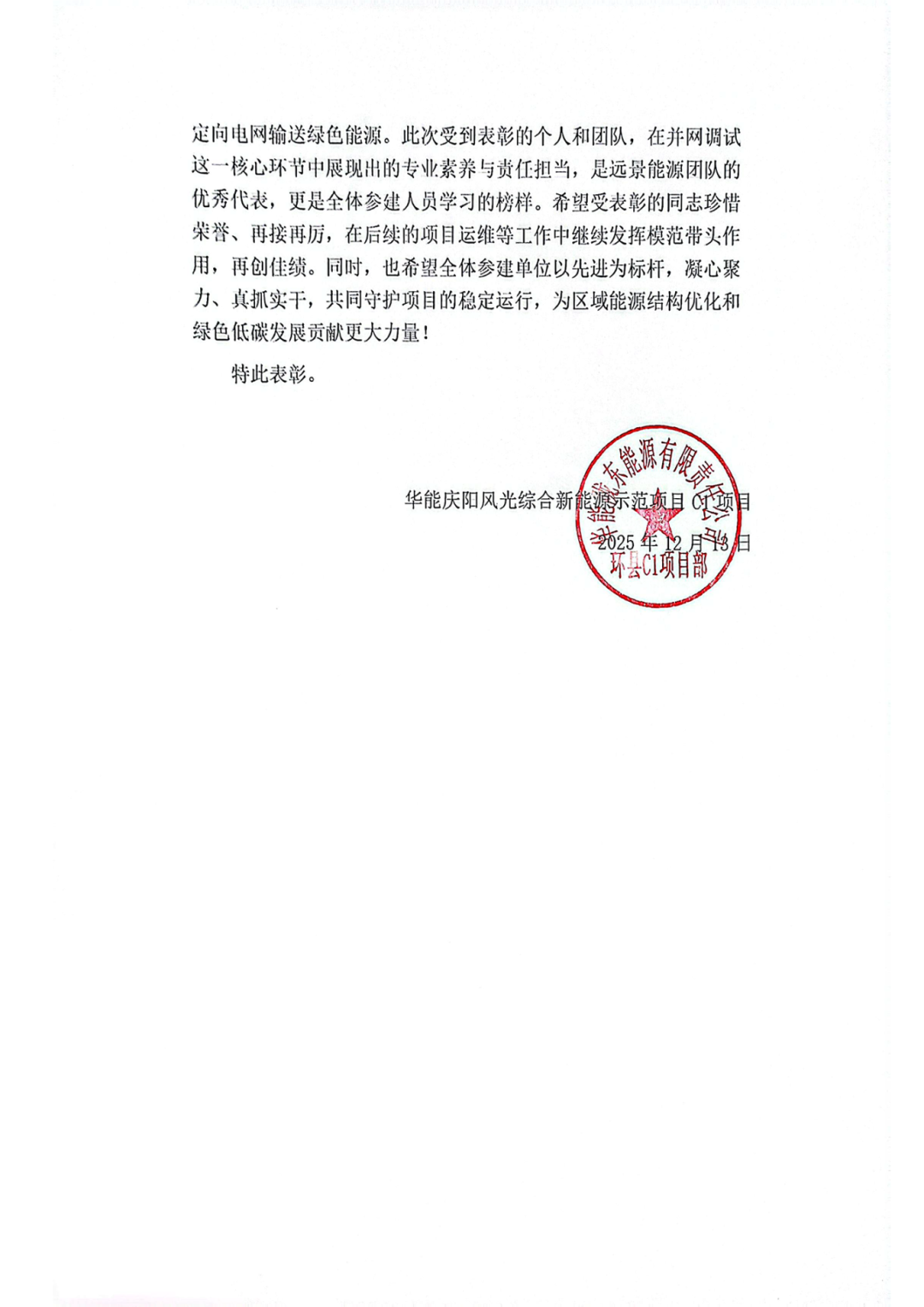 2023年6月,C1、A2、A1三个区块开工,2025年6-8月,三个区块顺利并网,创下两个月并网238台风机的行业最快并网纪录。截至2026年2月中旬,三个区块已累计发出11.36亿千瓦时绿电。2025年5月E1、E2区块开工,2026年4月6日全部吊装完成。在建设与并网的关键节点,业主单位的表扬信纷至沓来。