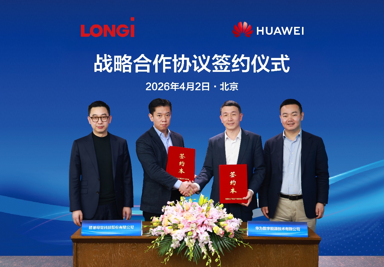 近日,隆基绿能科技股份有限公司(以下简称“隆基绿能”)与华为数字能源技术有限公司(以下简称“华为数字能源”)正式签署战略合作协议。隆基绿能副总裁佘海峰、华为中国数字能源业务总裁孟少云见证签约。隆基储能副总经理崔萌、华为中国数字能源智能光伏储能拓展部部长张光辉分别代表双方签署协议,双方将在储能系统集成、智能组串式PCS以及清洁能源大基地解决方案等方面展开深度合作,携手推动全球储能产业高质量发展。