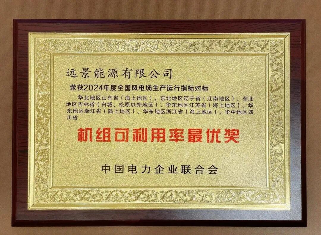 远景能源获得中电联2024全国风场生产运营指标对标机组可利用率最优奖