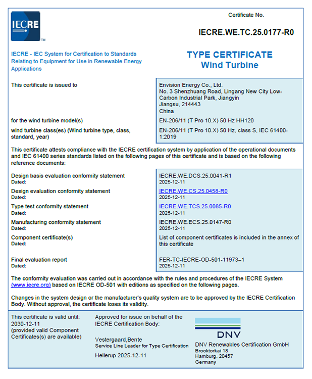近日,远景能源Model T Pro平台多款国际机型获权威认证机构DNV颁发的型式A证,其中EN-206/11智能风机涵盖50Hz–60Hz频率区间,适配钢塔、混塔等多种塔型,成为全球首批通过该认证的同类产品,这也是远景混塔首次获得IECRE国际部件认证。作为面向全球市场打造的全新一代智能风机平台,Model T Pro秉承“高可靠、高性能”第一性原理,在征战海外市场的同时,也具备高质量服务国内市场的优秀产品力,有望通过极致的性能表现和质量可靠性,破解国内市场“内卷”困局。