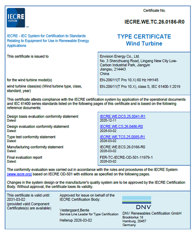DNV型式认证是国际风电市场公认的重要准入标准,也是衡量风机产品综合实力的标尺。型式A证需对整机展开独立、系统的全流程技术审查,覆盖设计评估、结构安全验证、载荷计算审查、控制系统评估及型式测试等关键环节,对产品设计能力、测试验证体系、工程实现水平和质量管理能力均提出了极高要求。相关认证流程复杂、技术审查深入,任何细节都必须经受严苛检验。多款机型顺利拿证,标志着远景风机产品在安全性、可靠性与电网友好性方面达到国际先进水平,展现了成熟的平台化开发能力与全球化质量管理水平,为其高质量挺进全球市场提供了坚实支撑。