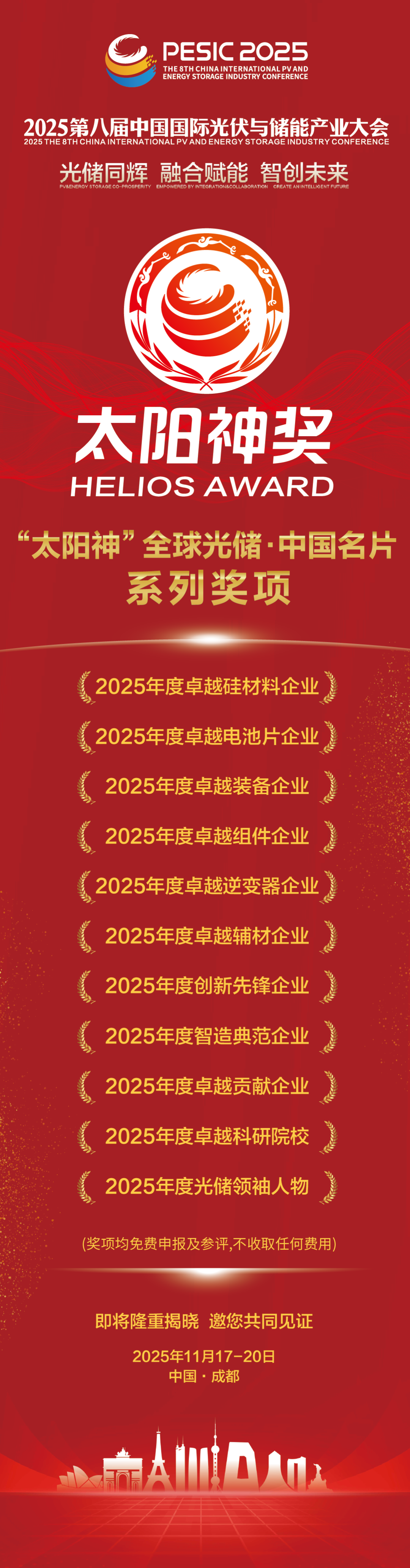 11月17-20日,以“光储同辉 融合赋能 智创未来”为主题的2025第八届中国国际光伏与储能产业大会将在中国成都隆重举行。大会期间,备受瞩目的“太阳神”全球光储·中国名片系列奖项将隆重揭晓,让我们共同见证中国光储产业的辉煌成就与先锋力量!