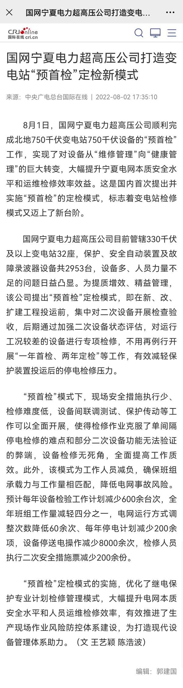【中央广电总台国际在线】国网宁夏电力超高压公司打造变电站“预首检”定检新模式