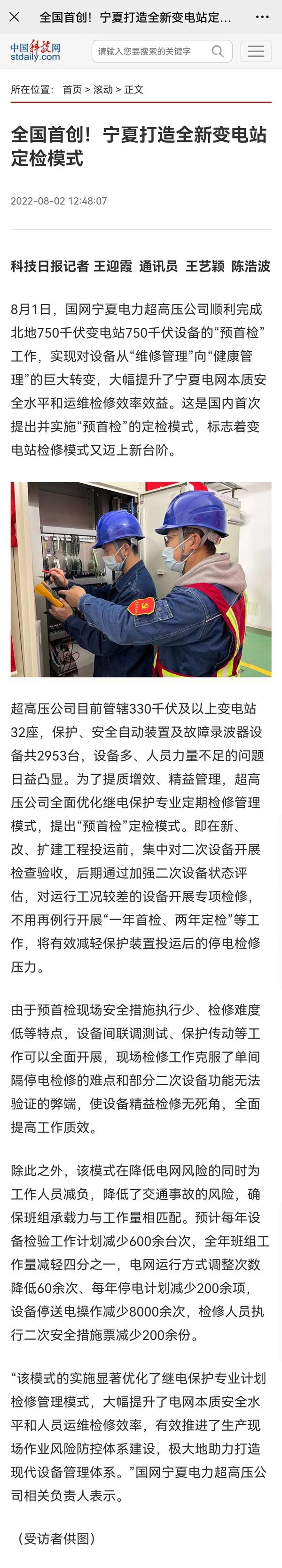 【国家电网报】变电站预首检定检模式在宁夏电网应用
