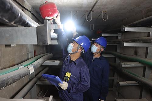邢台公司桥东供配电中心电缆班员工在电缆隧道内巡视悬挂式灭火器。成博浩摄