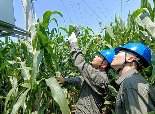 顺平县公司员工穿梭在玉米地里,对配电线路和设备进行巡视。刘丽仙摄
