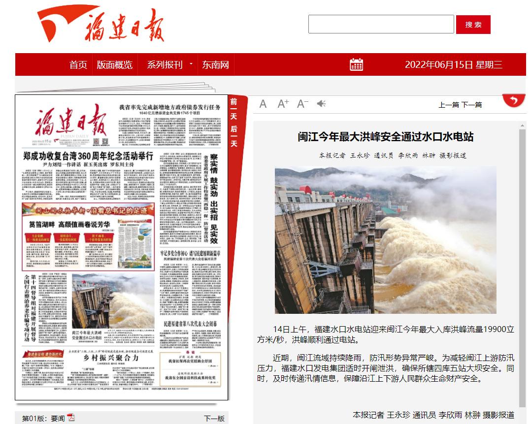 《福建日报》6月15日头版报道:14日上午,福建水口水电站迎来闽江今年最大入库洪峰流量19900立方米/秒,洪峰顺利通过电站。